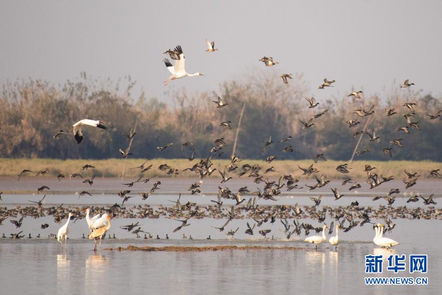 这是在鄱阳湖湿地地区江西省南昌市高新区鲤鱼洲管理处周边水域拍摄的越冬候鸟(11月5日摄)。新华社记者 彭昭之 摄