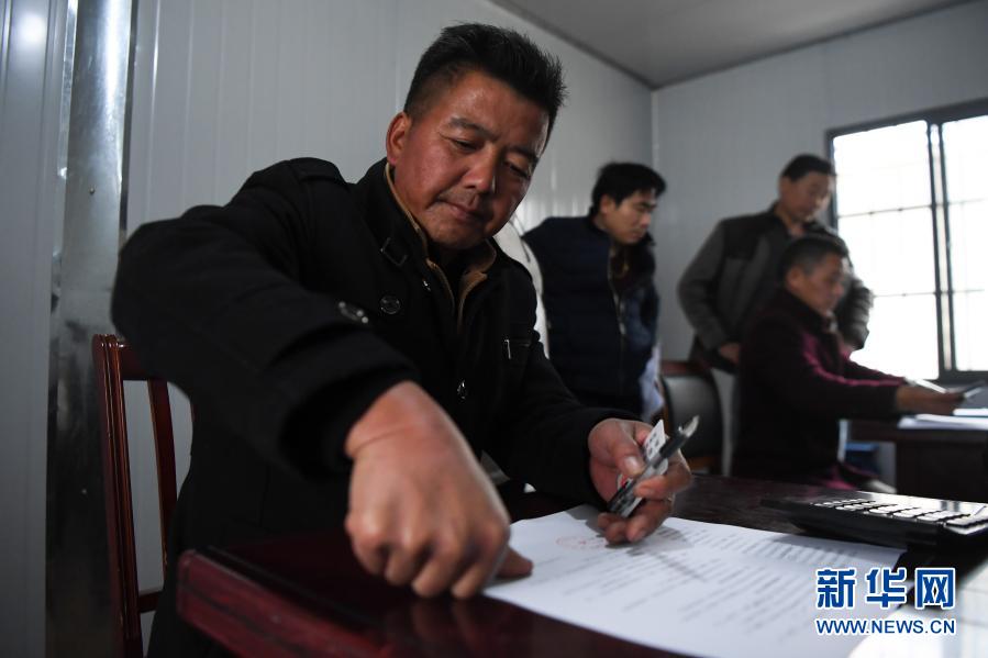 在湖南常德汉寿县蒋家嘴镇,一名过去在洞庭湖捕鱼的渔民在汉寿县捕捞渔民退捕协议书上按下手印(2019年12月17日摄)。新华社记者 薛宇舸 摄