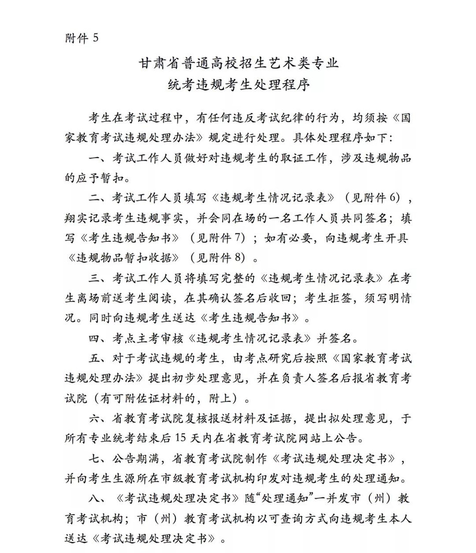 5.甘肃省普通高校招生艺术类专业统考违规考生处理程序