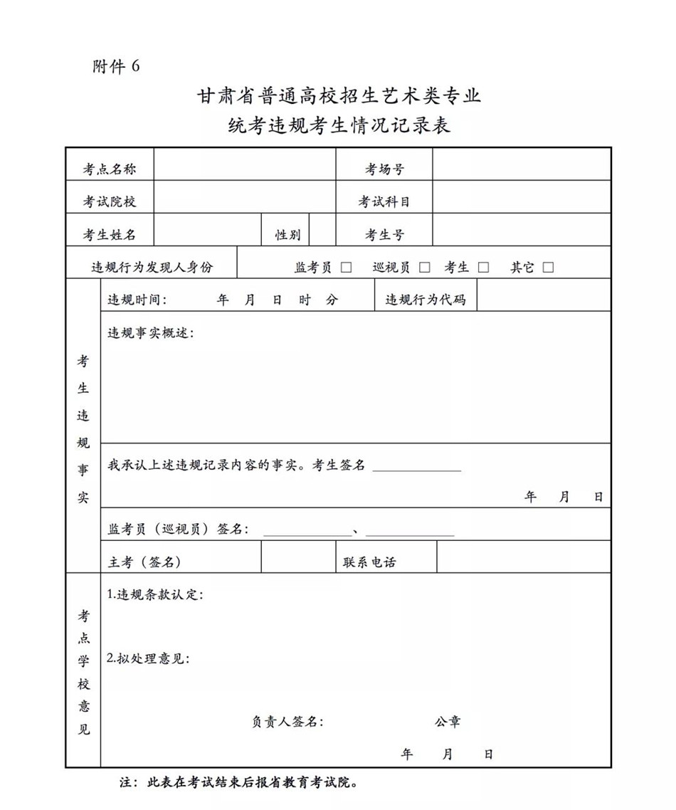 6.甘肃省普通高校招生艺术类专业统考违规考生情况记录表