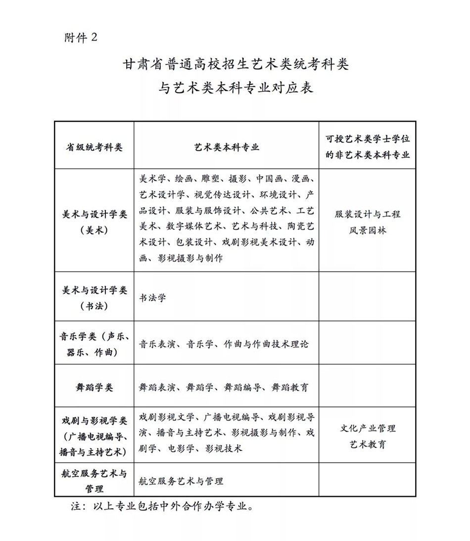 2.甘肃省普通高校招生艺术类统考科类与艺术类本科专业对应表