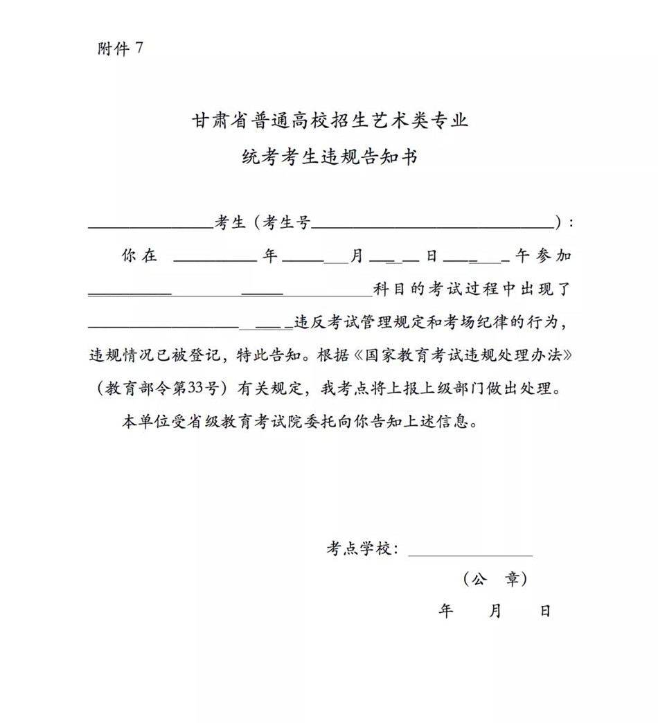 7.甘肃省普通高校招生艺术类专业统考考生违规告知书