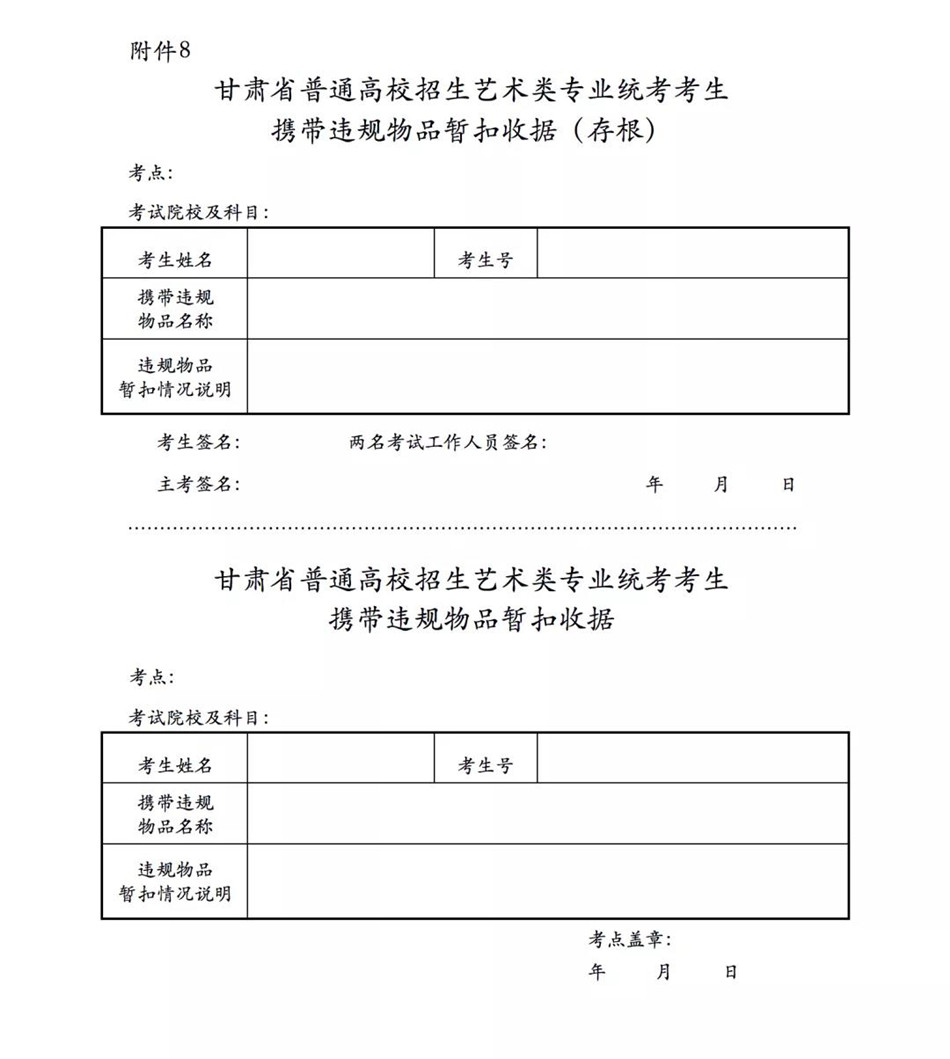 8.甘肃省普通高校招生艺术类专业统考考生携带违规物品暂扣收据