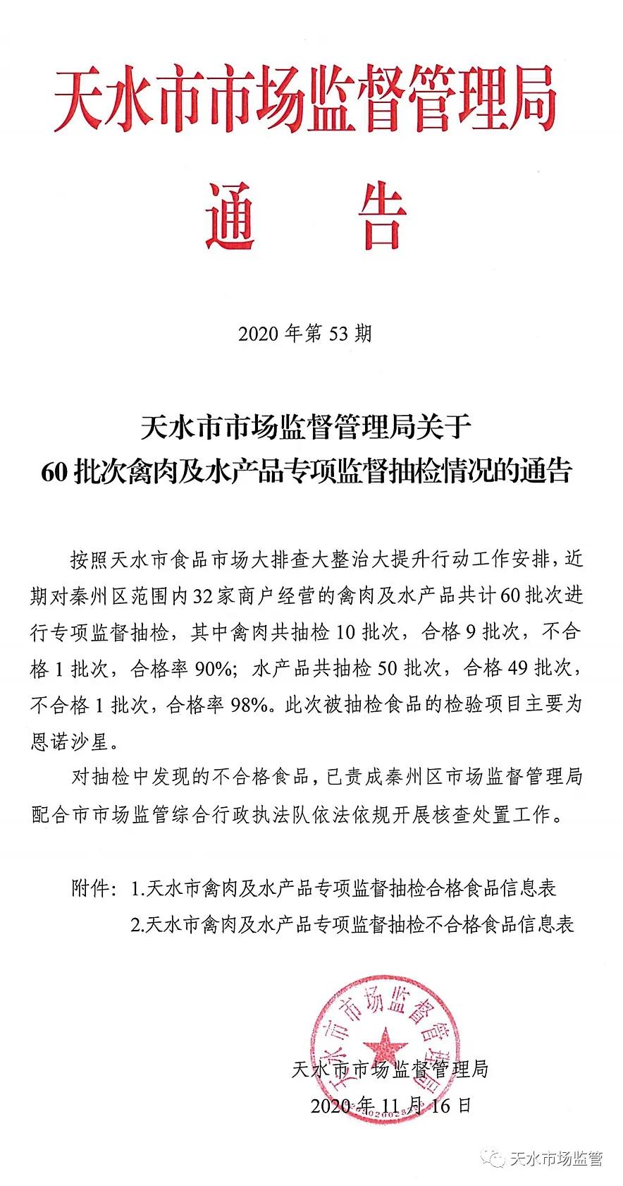 天水60批次禽肉及水产品专项监督抽检情况公布