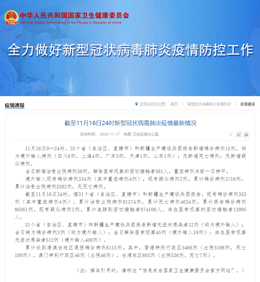 截至11月16日24时,据31个省(自治区、直辖市)和新疆生产建设兵团报告,现有确诊病例353例(其中重症病例4例),累计治愈出院病例81374例,累计死亡病例4634例,累计报告确诊病例86361例,现有疑似病例2例。累计追踪到密切接触者874106人,尚在医学观察的密切接触者13995人。