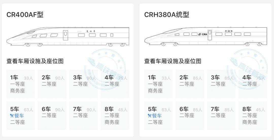 25G型空调车硬座一节车厢比CRH380A二等座多33个坐席;复兴号CRH400AF二等座定员90人,比和谐号多出5个席位。