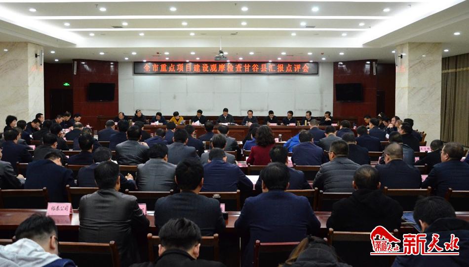 当天,观摩组对甘谷县医院迁建、锦绣名苑房地产开发、丰裕牧业科技示范园、甘谷县八大公路提升改造、恒远鞋业新建生产线、引洮二期配套甘谷县城乡供水城区工程、磐安镇污水处理工程、五金机电城、西城区九年制学校、阳光新居房地产开发、西环路道路工程、车场街片区棚户区改造、新城路道路提升改造、甘谷县花卉市场和甘谷平光玻璃工艺有限公司进行了观摩检查。随后,王军主持召开会议,听取甘谷县今年项目建设和主要经济指标完成情况汇报。会上,观摩组成员围绕甘谷县项目建设情况作了点评交流。