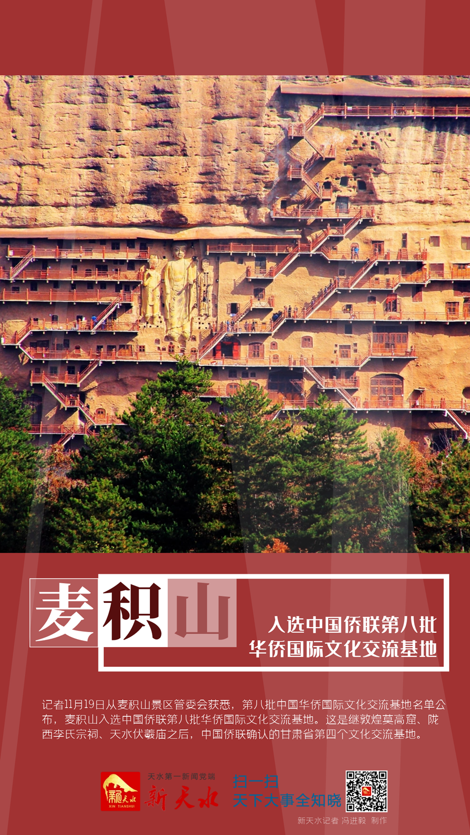 新天水讯【记者 黄虹】记者11月19日从麦积山景区管委会获悉,第八批中国华侨国际文化交流基地名单公布,麦积山入选中国侨联第八批华侨国际文化交流基地。这是继敦煌莫高窟、陇西李氏宗祠、天水伏羲庙之后,中国侨联确认的甘肃省第四个文化交流基地。