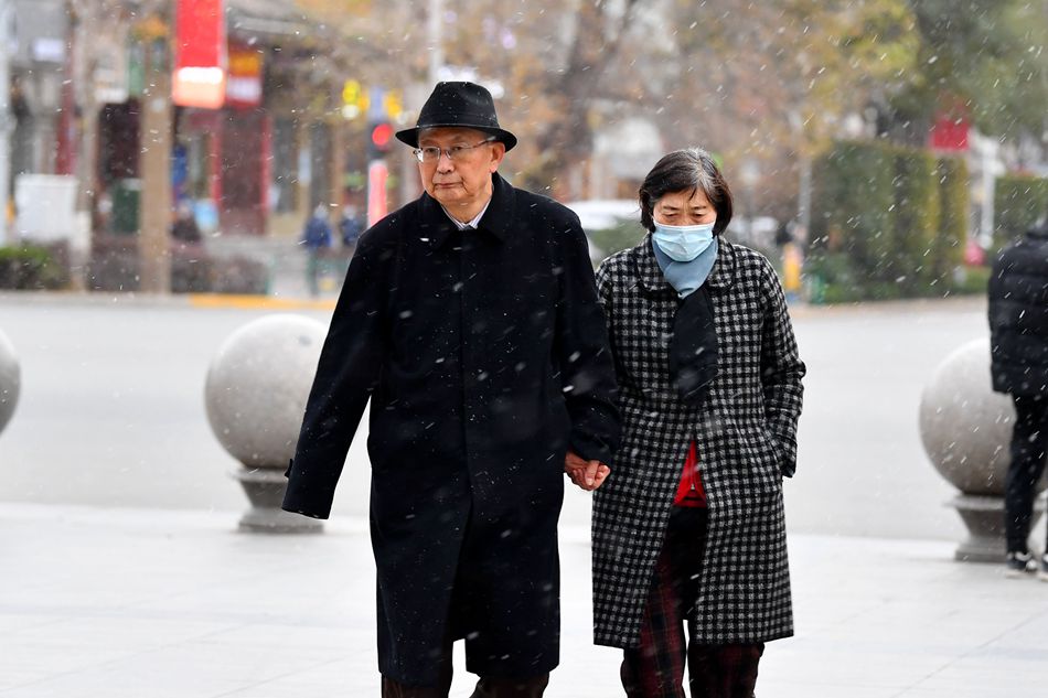 11月21日,我市市民在飘舞的雪花中行走。当日,我市迎来2020年冬天的首场降雪。