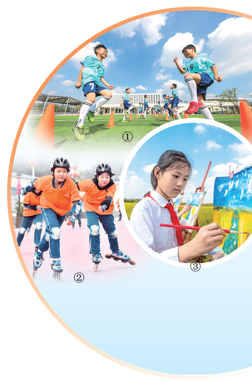 图①:浙江湖州市德清县下渚湖街道二都小学足球队队员在球场上热身。王正摄(影像中国) 图②:河北邯郸市永年区第四中学的学生们在练习轮滑。胡高雷摄(影像中国) 图③:江苏海安市城南实验小学学生用画笔描绘家乡美景。翟慧勇摄(影像中国) |