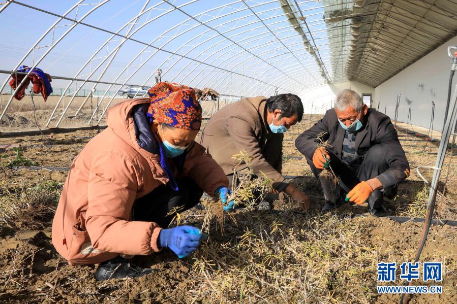 在新疆阿克苏地区乌什县阿合雅镇吐曼村沙棘苗圃基地,员工在培育苗圃(11月7日摄)。新华社记者 张曼 摄