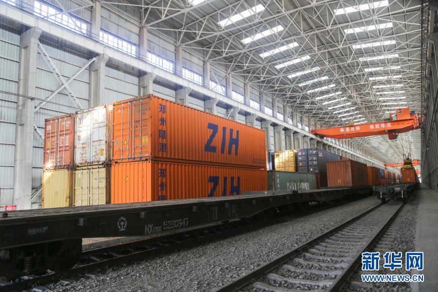 新疆阿拉山口站综合换装库(三区)内等待换装的集装箱(9月29日摄)。新华社发(于苏甫·艾尼 摄)