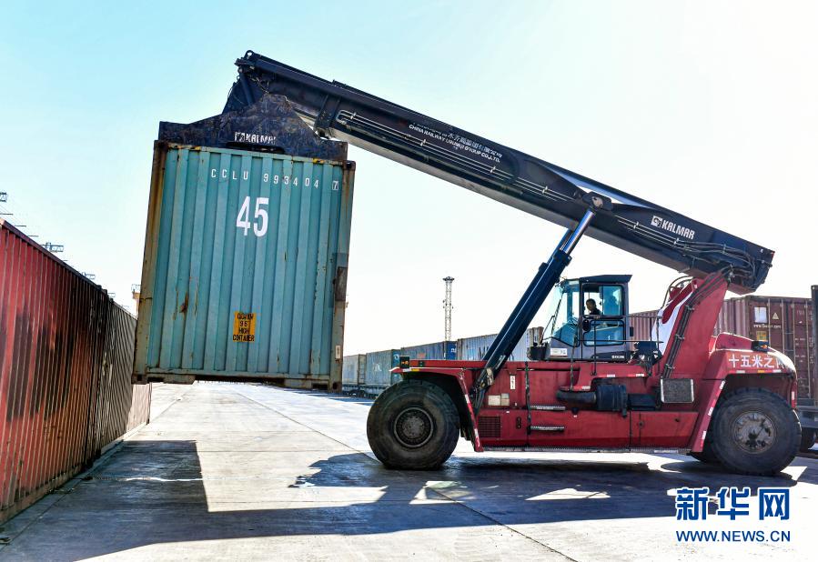 工人在中欧班列乌鲁木齐集结中心吊运货物(3月12日摄)。新华社记者 王菲 摄