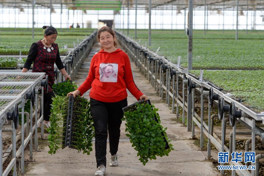 在新疆阿克陶县现代设施农业产业扶贫基地,工人在育苗温室内搬运菜苗(3月22日摄)。新华社记者 丁磊 摄
