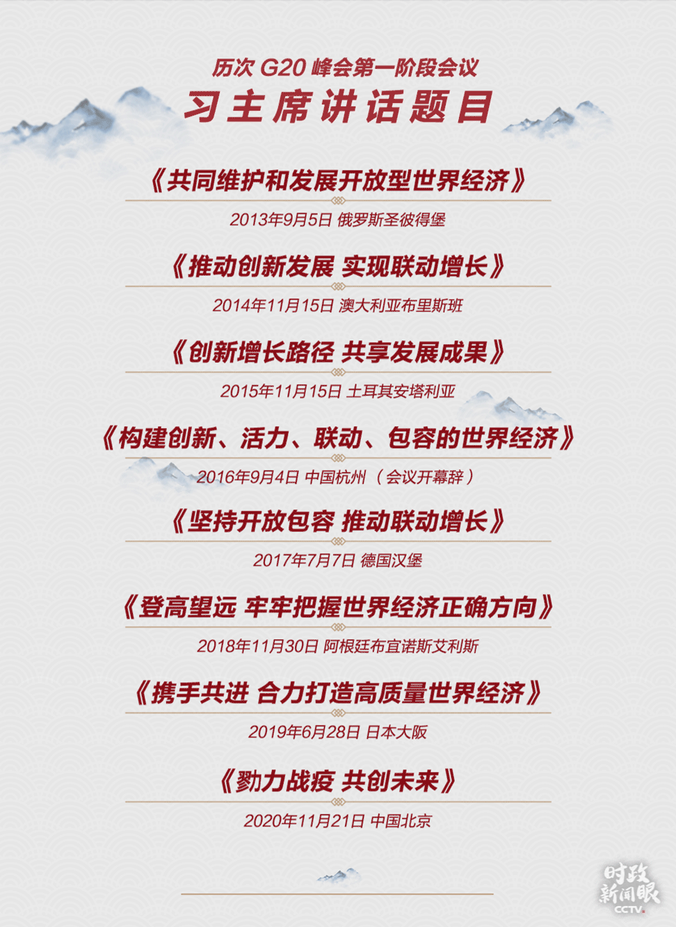 11月21日晚,连续第八年出席G20峰会的习主席在峰会第一阶段会议上发表题为《勠力战疫 共创未来》的讲话,既提出抗疫情、稳经济、保民生的路线图,也呼吁G20在全球治理方面发挥更大引领作用。