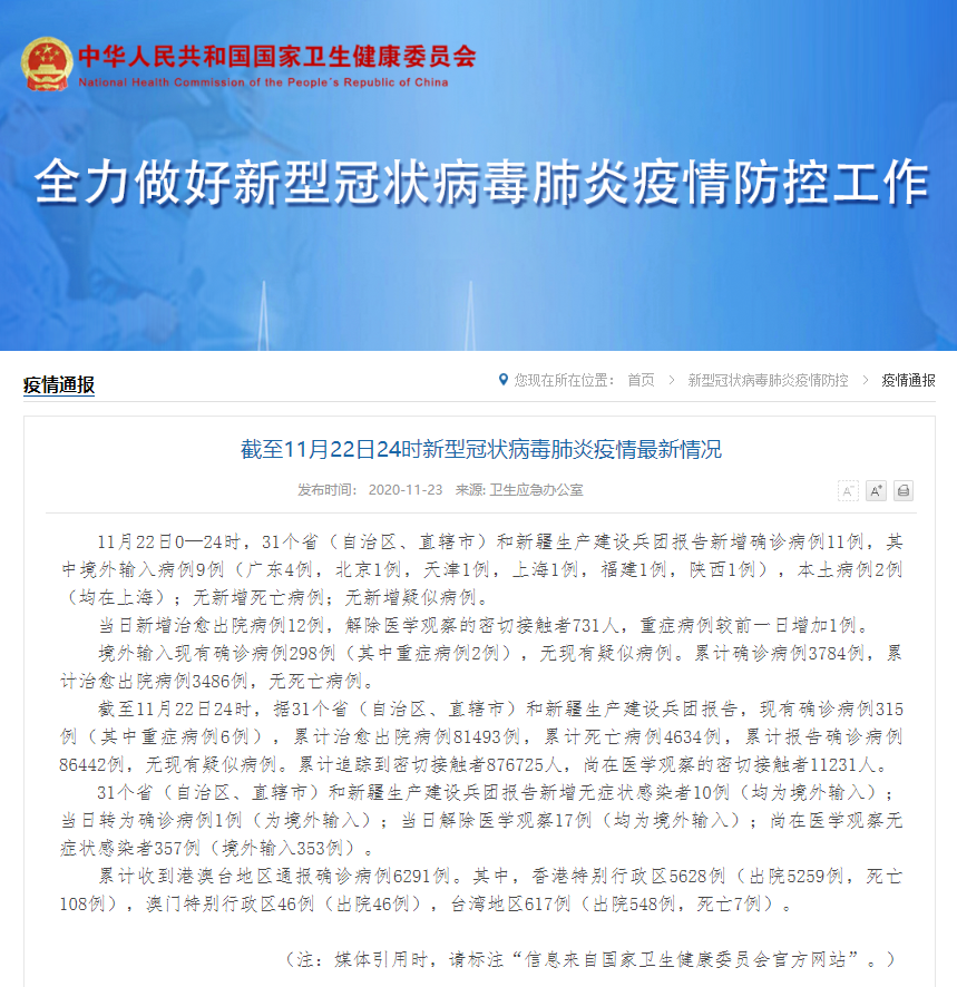 截至11月22日24时新型冠状病毒肺炎疫情最新情况