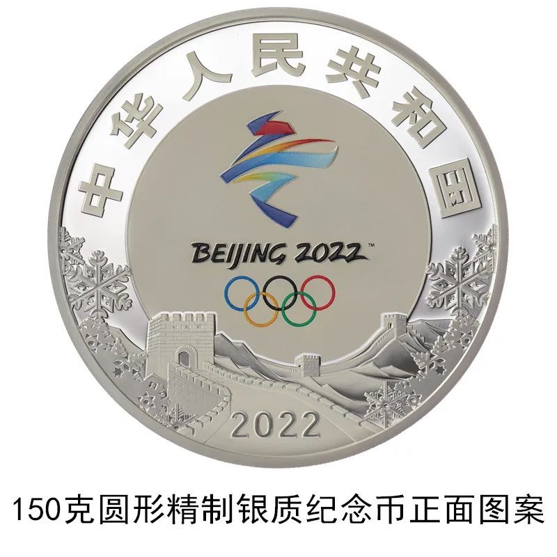 150克圆形银质纪念币背面图案为清代《冰嬉图》元素组合设计,并刊“第24届冬季奥林匹克运动会”字样及面额。