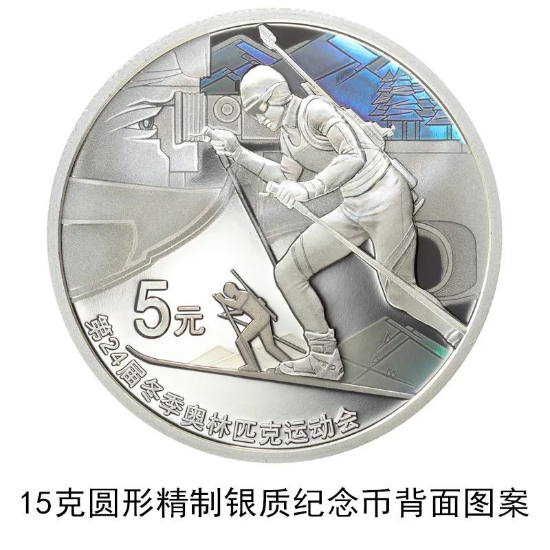 15克圆形银质纪念币背面图案为冬季两项运动造型等装饰组合设计,并刊“第24届冬季奥林匹克运动会”字样及面额。