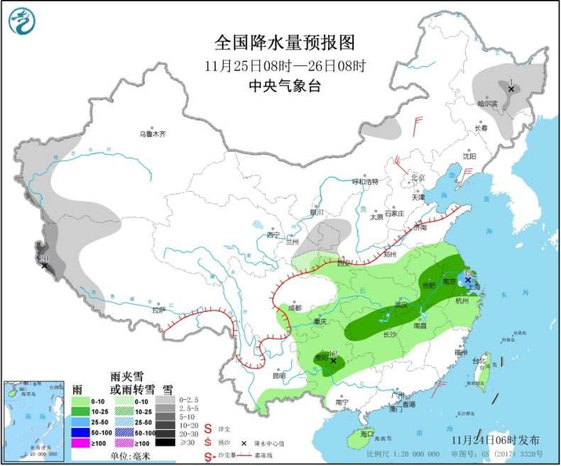 11月25日,内蒙古中部、黑龙江大部、吉林东北部、新疆西南部、西藏西部、西北地区东北部等地部分地区有小到中雪或雨夹雪,其中,西藏西部等地局地有大雪或暴雪。西北地区东南部、黄淮南部、江淮、江汉、江南大部、西南地区东部、华南西北部、海南岛、台湾岛等地部分地区有小到中雨,其中,江苏南部、上海大部、浙江北部等地局地有大雨(25~35毫米)。