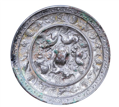“唐代瑞兽葡萄纹铜镜也是我们馆藏的珍品。”李宁民说,葡萄是从西域传入的物种之一,唐代时普及于中原,成为铜镜上常见的纹饰。这面铜镜采用高浮雕工艺,极具立体美感,是唐代铜镜的杰出作品。瑞兽纹和葡萄纹都传递着美好的寓意,体现了中西方文化的交融。