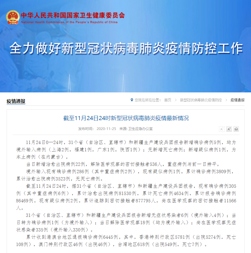 11月24日0—24时,31个省(自治区、直辖市)和新疆生产建设兵团报告新增确诊病例5例,均为境外输入病例(上海2例,福建1例,广东1例,陕西1例);无新增死亡病例;新增疑似病例1例,为本土病例(在内蒙古)。