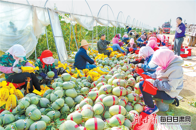 工人正在包装花海蜜瓜。