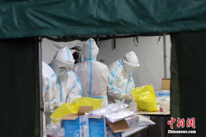 ↑11月21日,受新冠肺炎疫情影响,天津市滨海新区对辖区内全体居民进行大规模核酸检测筛查。图为核酸检测取样现场忙碌的医务工作者。 中新社记者 张道正 摄