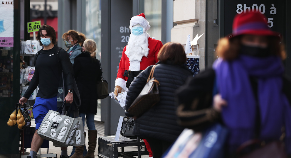 ▲2020年11月25日,人们从法国巴黎一家超市外戴口罩的圣诞老人模特旁走过。图/新华社发