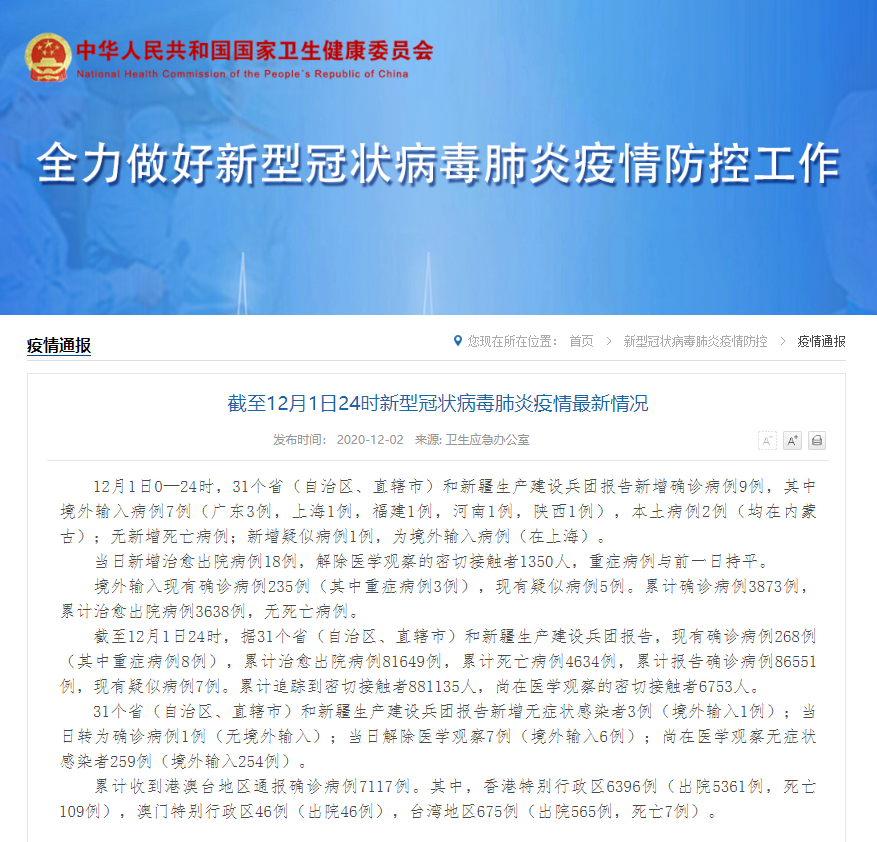 截至12月1日24时,据31个省(自治区、直辖市)和新疆生产建设兵团报告,现有确诊病例268例(其中重症病例8例),累计治愈出院病例81649例,累计死亡病例4634例,累计报告确诊病例86551例,现有疑似病例7例。累计追踪到密切接触者881135人,尚在医学观察的密切接触者6753人。