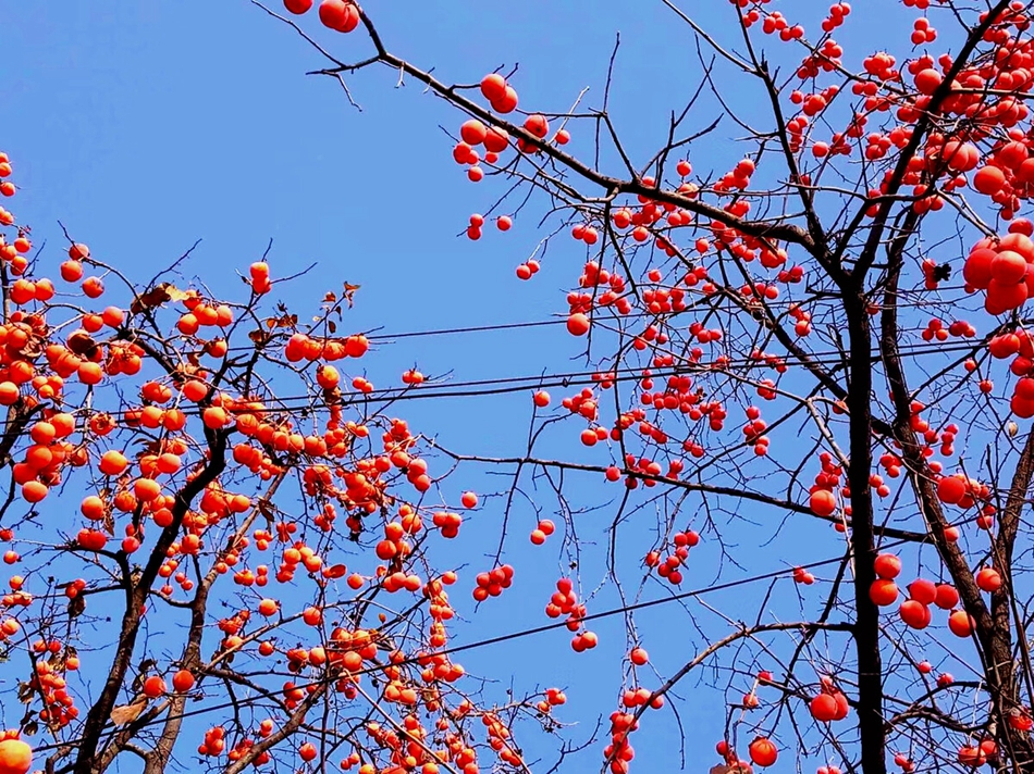 “白露打核桃,霜降摘柿子。”有些柿子结在很高的枝头上,倔强地翘首于枝巅,色彩灼灼如火,格外抢眼,如吉祥的灯盏,照亮秋末的寂寞和萧索。刘禹锡《咏红柿子》诗:“晓连星影出,晚带日光悬。本因遗采掇,翻自保天年。”把这种情状描绘的惟妙惟肖。