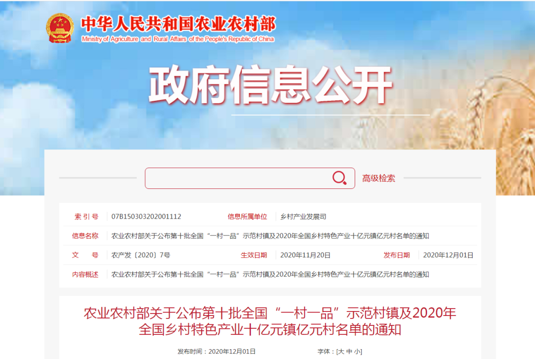 据农业农村部官网消息,为加快发展乡村产业,农业农村部开展第十批全国“一村一品”示范村镇认定和全国“一村一品”示范村镇监测。经各省(区、市)农业农村部门遴选推荐、农业农村部组织专家评审和网上公示,认定北京市房山区大石窝镇辛庄村等423个村镇为第十批全国“一村一品”示范村镇,推介河北省保定市安国市郑章镇等91个镇(乡)为2020年全国乡村特色产业十亿元镇、北京市房山区窦店镇窦店村等136个村为2020年全国乡村特色产业亿元村。