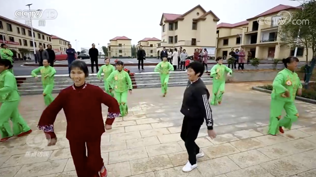 除此之外,各地还组织群众积极参与到健身行列中来,在江西吉安杉溪村,原先村民们闲暇时就喜欢聚在一起打牌,既不健康也容易产生矛盾。如今每天的一早一晚,在安置小区的舞台上,就会聚集起一群跳广场舞的村民。