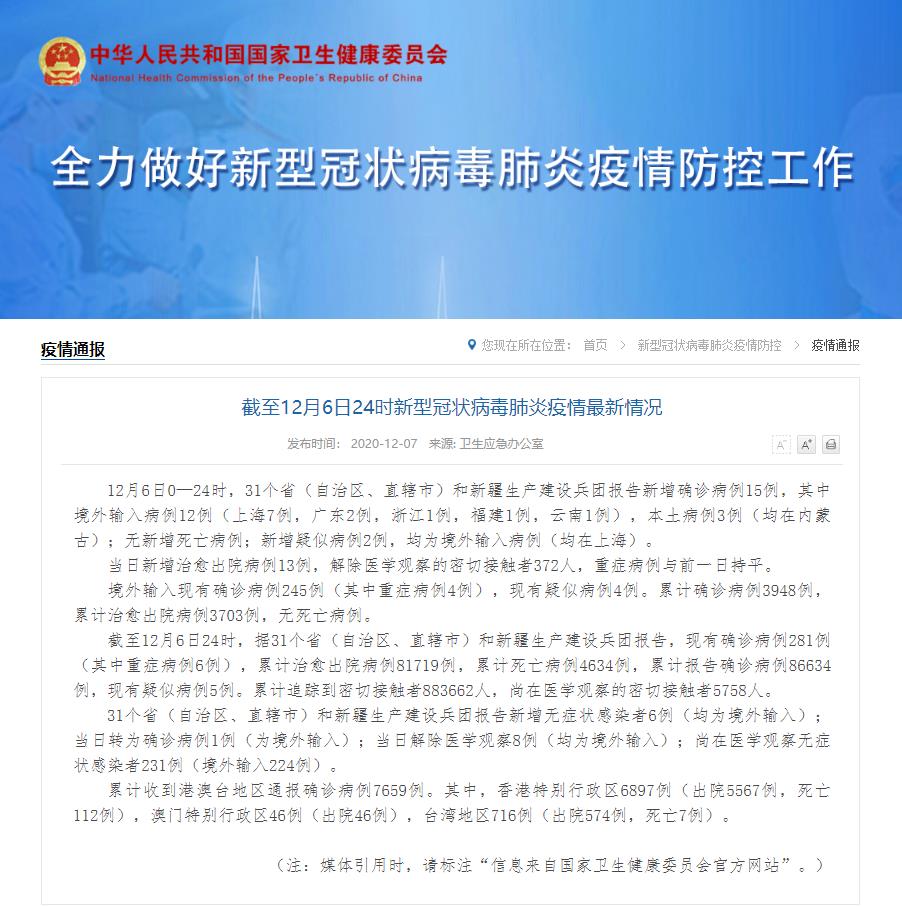 12月6日0—24时,31个省(自治区、直辖市)和新疆生产建设兵团报告新增确诊病例15例,其中境外输入病例12例(上海7例,广东2例,浙江1例,福建1例,云南1例),本土病例3例(均在内蒙古);无新增死亡病例;新增疑似病例2例,均为境外输入病例(均在上海)。
