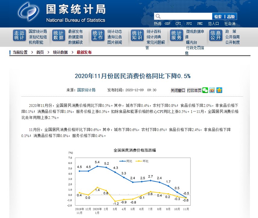 2020年11月份,全国居民消费价格同比下降0.5%。其中,城市下降0.4%,农村下降0.8%;食品价格下降2.0%,非食品价格下降0.1%;消费品价格下降1.0%,服务价格上涨0.3%。扣除食品和能源价格的核心CPI同比上涨0.5%。1—11月,全国居民消费价格比去年同期上涨2.7%。