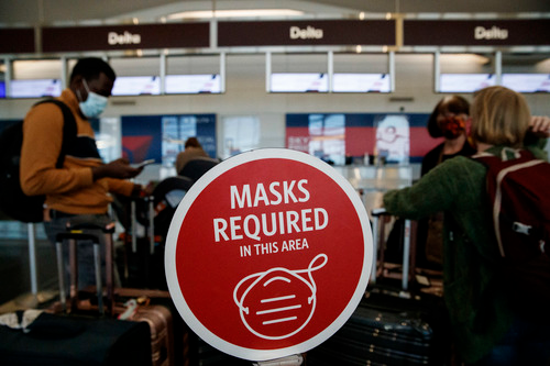 11月24日,在美国弗吉尼亚州阿灵顿的里根国家机场,戴口罩的旅客们站在一处要求佩戴口罩的标识旁。新华社发(沈霆摄)
