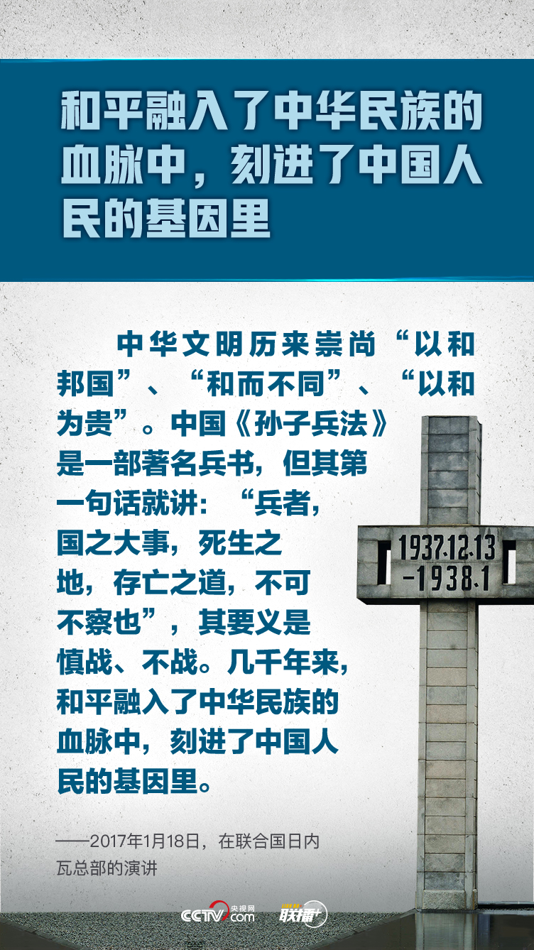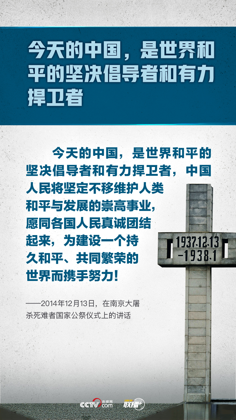 习近平总书记曾指出:“我们为南京大屠杀死难者举行公祭仪式,是要唤起每一个善良的人们对和平的向往和坚守,而不是要延续仇恨。”党的十八大以来,总书记多次发表关于珍爱和平的重要论述。央视网《联播+》特梳理,与您一起以尊崇之心珍视和平,以民族之力矢志复兴。