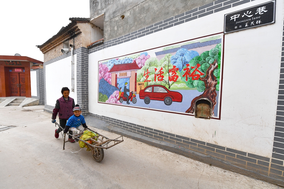 近日,在秦安县西川镇下王峡村,一位老人推着坐在小推车上的孩子从中心巷一面“生活富裕”的彩色绘画墙前走过。下王峡村深入推动农村人居环境整治工作,在主巷道绘制了以党的建设、村规民约、乡村振兴、传统文化、传统美德、乡风文明等为主要内容的宣传画40余幅,在美化村庄的同时,寓教于乐,让村民在潜移默化中接受传统美德和乡风文明教育,努力营造环境优美、整洁有序的人居环境,不断提升群众的幸福感、获得感。