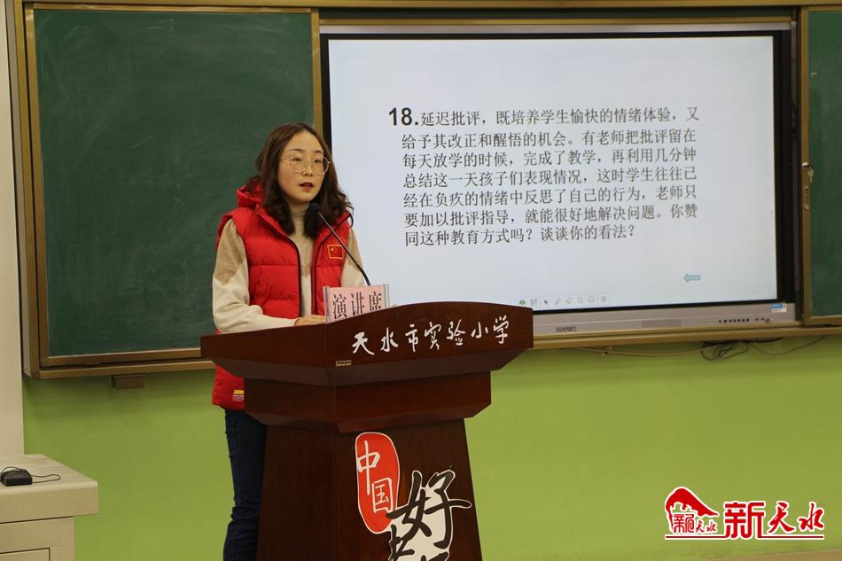 新天水讯(特约记者 妥金录 通讯员 成龙)为全面贯彻党的十九届五中全会精神,促进班主任专业化成长,提高班主任班级管理水平,12月16日,天水市实验小学举行了“教育智慧”班主任技能大赛。班主任现场抽取比赛题目,主要围绕教育艺术、疫情防控、安全教育、环保教育、协同育人等方面即兴回答,评委随机进行点评,考查了班主任巧妙运用教育智慧解决问题的能力。
