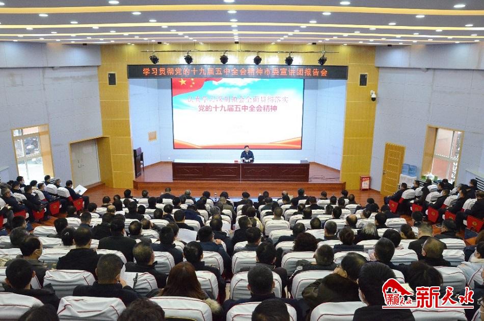 新天水讯【记者 马凯】12月17日下午,市委常委、宣传部部长张建杰给分管联系部门宣讲党的十九届五中全会精神。他强调,要坚持以讲政治的高度、学透彻的深度、运用好的态度,把学习宣传和贯彻落实党的十九届五中全会精神放在心上、拿在手上、落实在行动上。