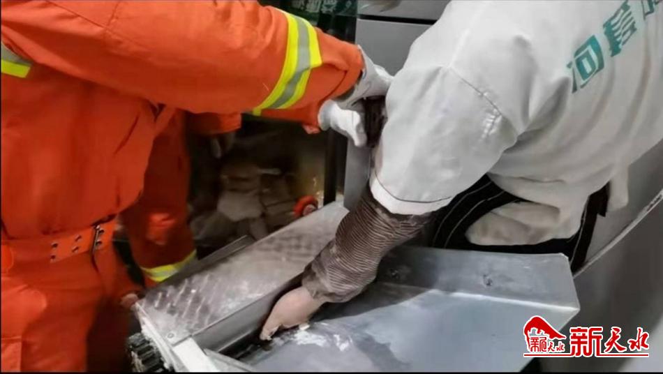 新天水讯【记者蔚军平】12月18日上午,麦积区一面馆的店员在操作压面机时,其左手不慎被卡在压面机的滚筒中,经过消防员破拆压面机,男子最终得以脱险。