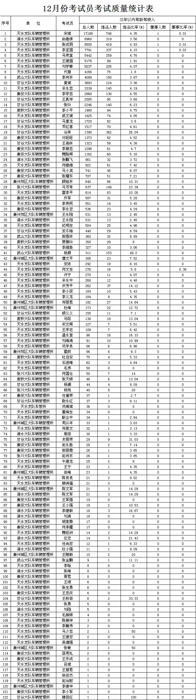 为切实加强道路交通安全源头管理,提升机动车驾驶人考试工作水平,强化考试员培训和考试质量监督,根据《机动车驾驶证申领和使用规定》(公安部139号令)要求,天水市公安局交警支队对12月份全市考试员考试质量公布如下: