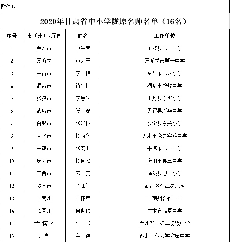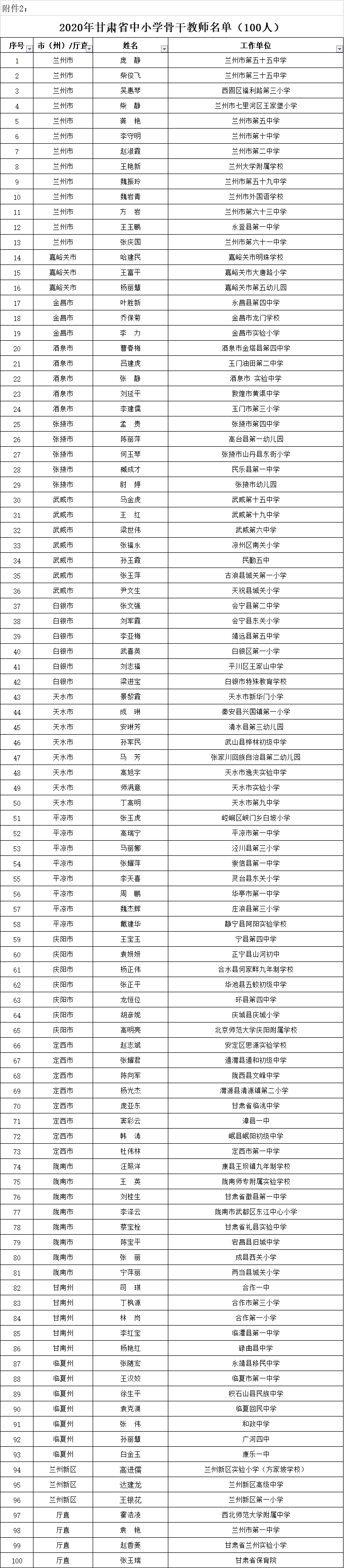 甘肃省教育厅关于对2020年甘肃省中小学陇原名师、骨干教师和农村骨干教师评选名单进行公示