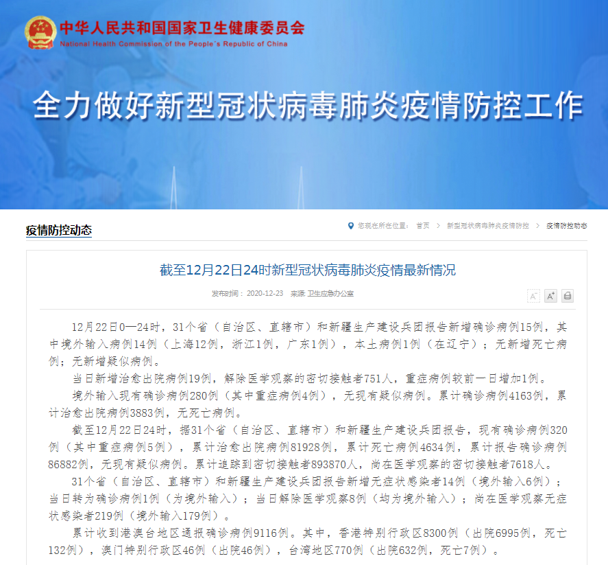 截至12月22日24时新型冠状病毒肺炎疫情最新情况