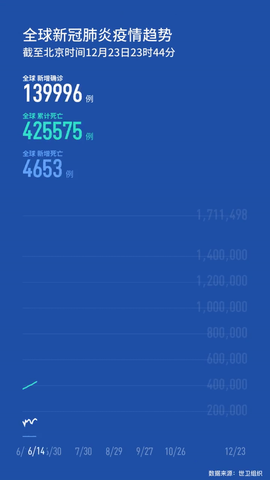 世卫组织网站最新数据显示,截至欧洲中部时间23日16时44分(北京时间23时44分),全球确诊病例较前一日增加570357例,达到76858506例;死亡病例增加11496例,达到1711498例。