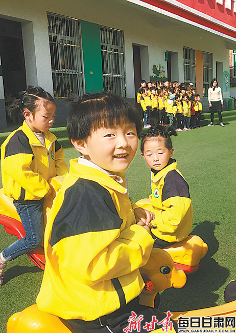 临夏县漫路乡漫路中心小学里,身着统一服装的幼儿园小朋友们三三两两开心地滑滑梯、玩跷跷板。
