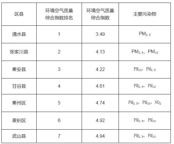 12月份,各县区环境空气质量排名由好到差分别为:清水县3.49、张家川县4.13、秦安县4.22、甘谷县4.61、秦州区4.74、麦积区4.92、武山县4.94。