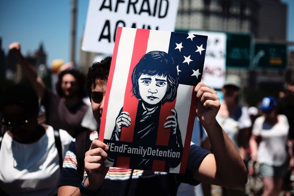 2018年6月30日,在美国纽约布鲁克林大桥,人们举行游行,抗议造成“骨肉分离”的移民政策。(新华社记者李木子摄)