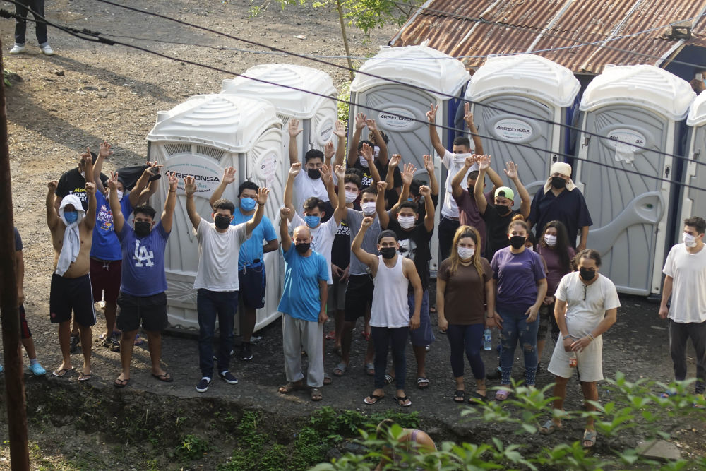 2020年5月17日,在萨尔瓦多首都圣萨尔瓦多,从美国遣返回国的卡洛斯(化名)(前左三)和其他被遣返移民在一处集中隔离点内招手。新华社发