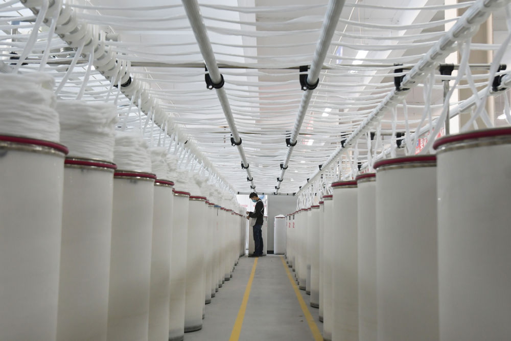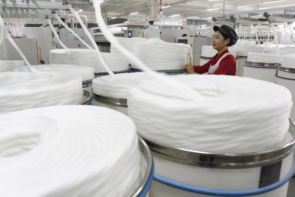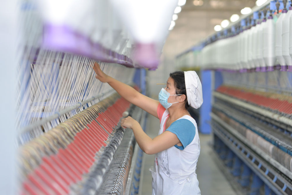 1月5日,工人在甘肃省临夏回族自治州东乡族自治县达板镇一纺织扶贫车间内作业。