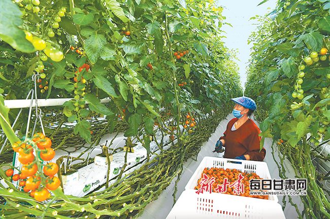 在民乐县的张掖海升现代农业有限公司,建设的亚洲单体规模最大、种植技术最先进、节能环保程度最高的现代智能玻璃温室,温室内光、温、水、气等环境调控全部实现智能化,技术操作实现了自动化,节水率达90%以上,年产彩椒、串番茄等果蔬达到5600吨,全部销往国内高端市场,农业亩产均值达到了创纪录的百万元,相当于全县170万亩农业用地全部种植小麦的经济收益总和,颠覆了传统观念对农业的认知。